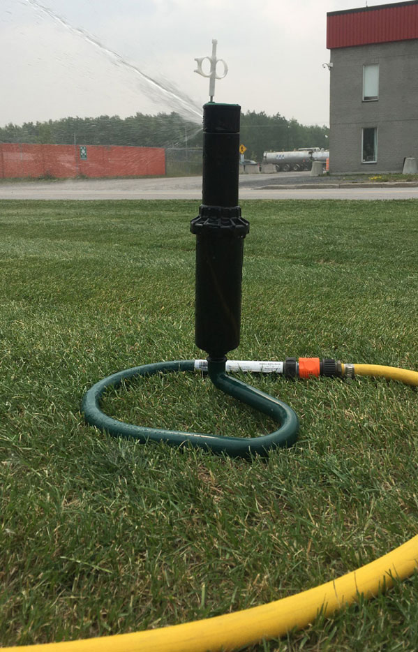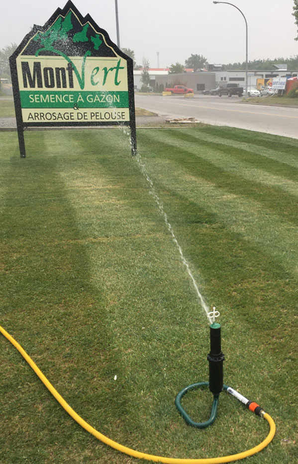 Vous le branchez et il arrose! AUCUNE INSTALLATION REQUISE! Conçu pour les gens qui veulent ça le plus simple possible. Vous couvrirez un rayon de 360 degrés (ajustable entre 40 et 360 degrés) et arroserez sur une distance ajustable entre 10 et 52 pieds (selon la pression de votre ville).