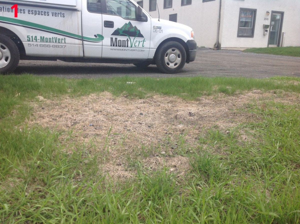 On aperçoit une zone endommagée suite au stationnement d'une voiture sur la pelouse au cours de l'hiver.