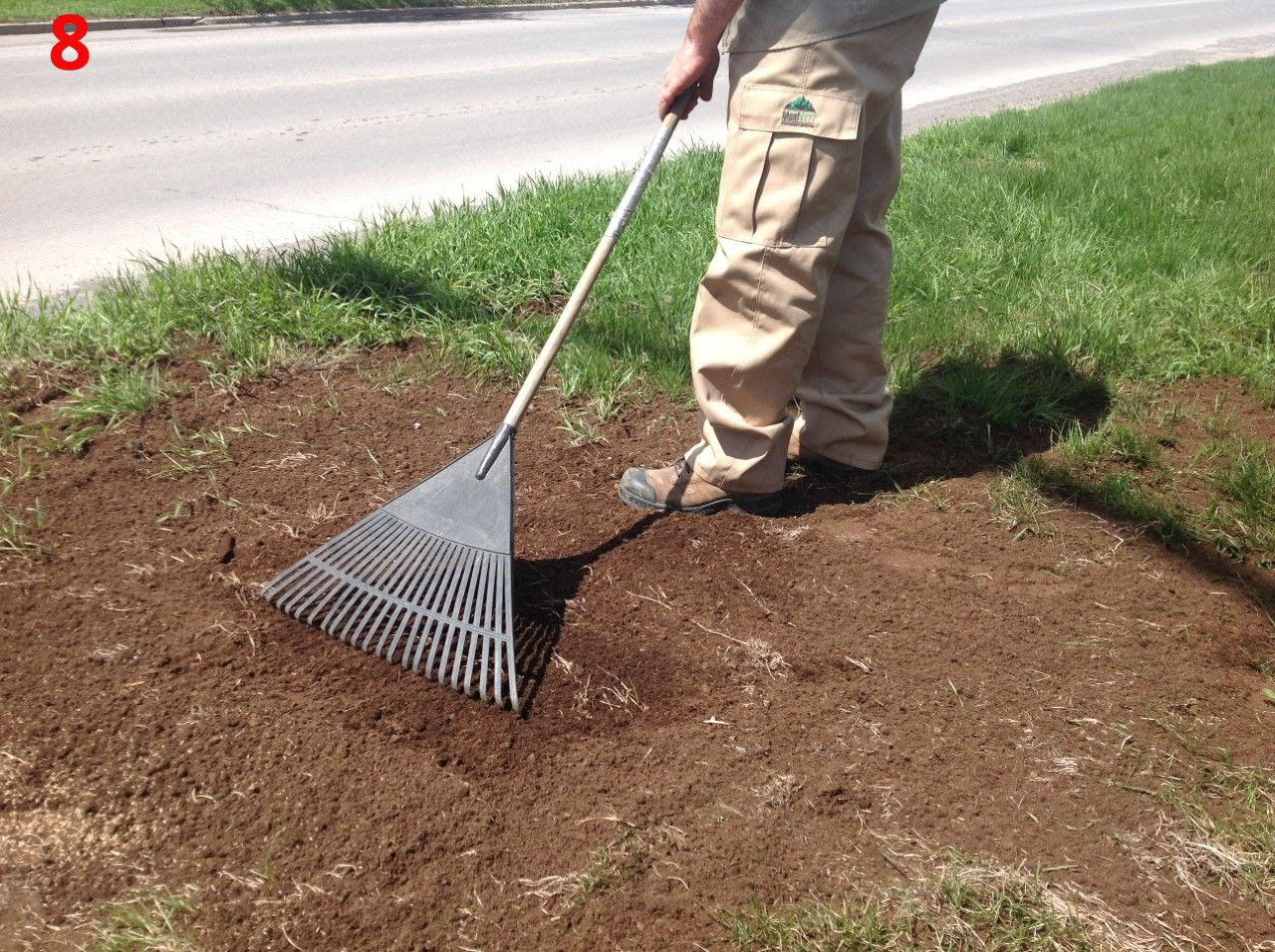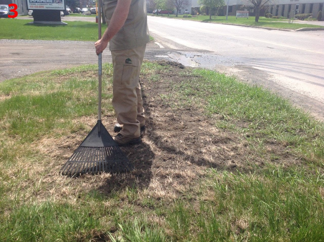 Bien étendre la terre et finir avec un râteau à feuilles pour venir jointer à niveau égal avec le gazon/chaume existant. Étant donné que le chaume existant était au même niveau que la zone à réparer nous avons mis une mince couche de terre (moins de 1 centimètre). Pour répondre à la question plus haut (mettre de la tourbe ou de la semence?) c'est ça dans le cas présent qui a justifié notre choix. Parce que le niveau de la zone à réparer est resté identique au gazon existant, il était plus simple de déposer une fine couche de terre et de semer. Dans le cas où nous aurions voulu mettre de la tourbe, il aurait fallu creuser l'équivalent de l'épaisseur de la tourbe soit +- 3 pouces sur toute notre surface à réparer.