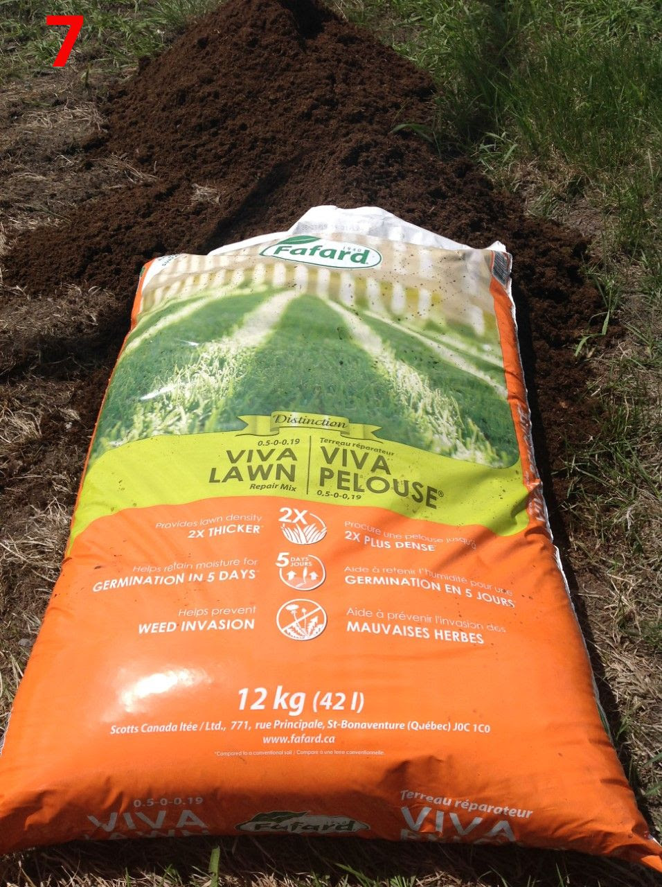 Vous pouvez lire notre article ne pas épandre de terre dans les zones gazonnées, mais quand on fait du semis, on doit mettre un peu de terre sur les zones endommagées pour favoriser la germination et l'établissement de la semence. Nous recommandons la marque Fafard et le produit s'appelle Viva Pelouse que vous retrouverez dans les pépinières spécialisées.
